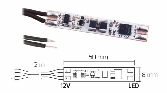 Wyłącznik XC60 dotykowy z podświetleniem do profili LED. Posiada przewód o dł. 2 m ułatwiający podłączenie.