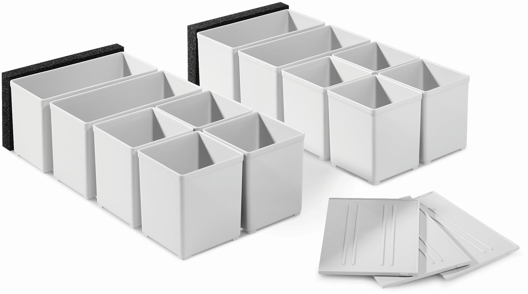 8 x pojemniczki Box 60 x 60 x 71 mm, 4 x pojemniczki Box 60 x 120 x 71 mm, 3 x przegródki, 2 x wyściółka zabezpieczająca, w kartonie